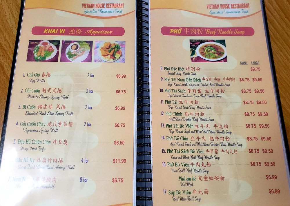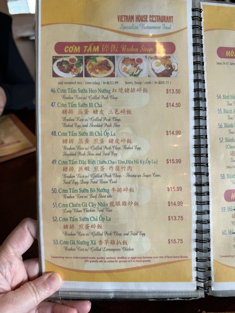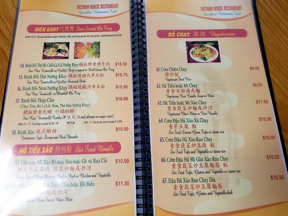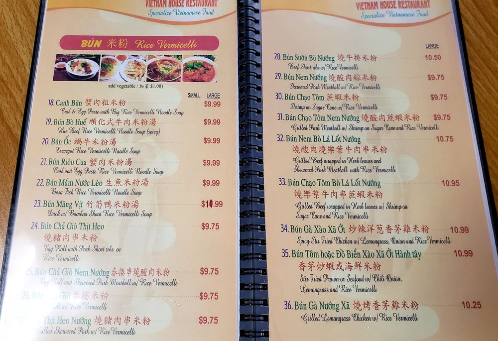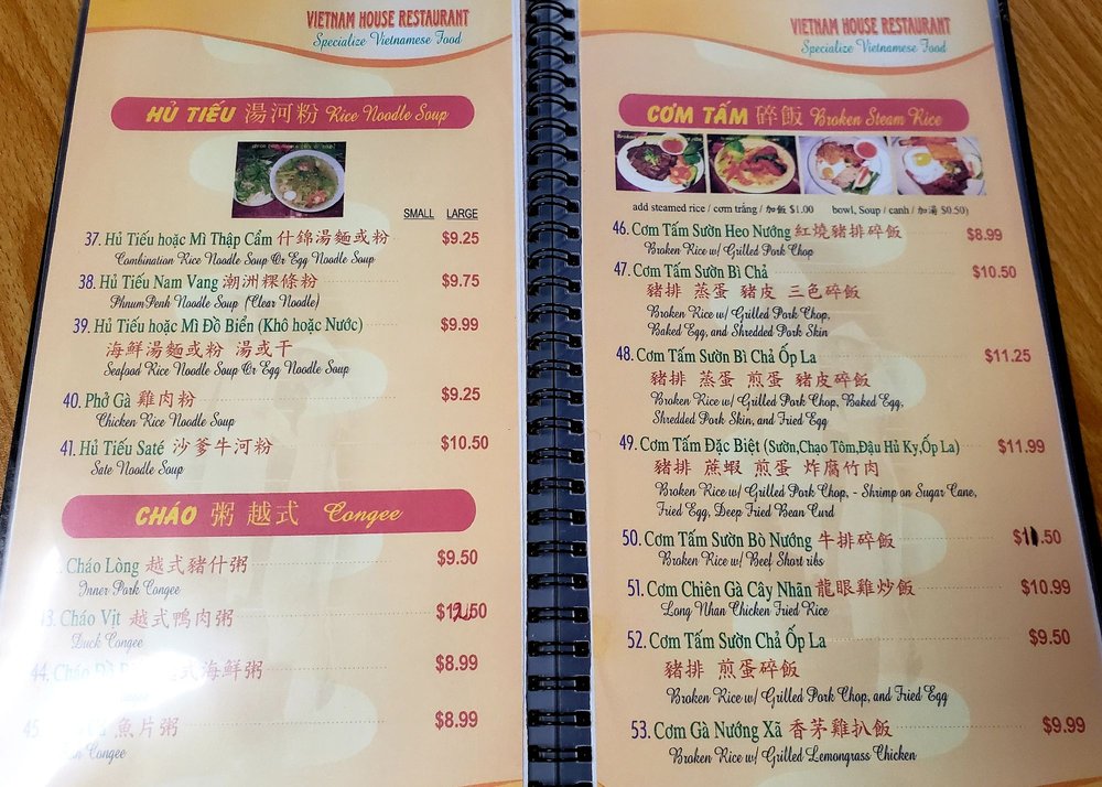 Introducing the menu at Vietnam House, located in Seattle's historic Chinatown-International District. Offering a fusion of Chinese and Vietnamese cuisine, the restaurant boasts a plethora of appetizers such as Cha Gio Egg rolls and Dau Hu Ky Deep-fried bean curd shrimp rolls. The Hu Tieu section features delectable noodle soups like Hu Tieu Nam Vang and Pho Ga. Customer reviews rave about the flavorful dishes, including the Bún măng vịt (duck noodle soup) and Com Tam Suon Bi Cha (broken rice with pork chop and pork skin baked egg). The menu is diverse, with options for vegetarians and meat-lovers alike. Vietnam House provides a cozy and authentic dining experience, perfect for groups, families, or a casual lunch or dinner. Delivery and takeout options are available for those looking to enjoy these mouthwatering dishes at home.
