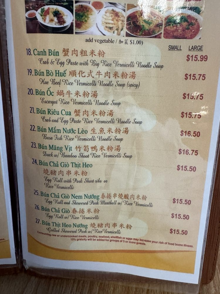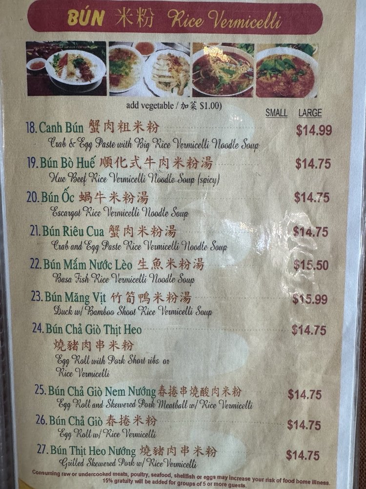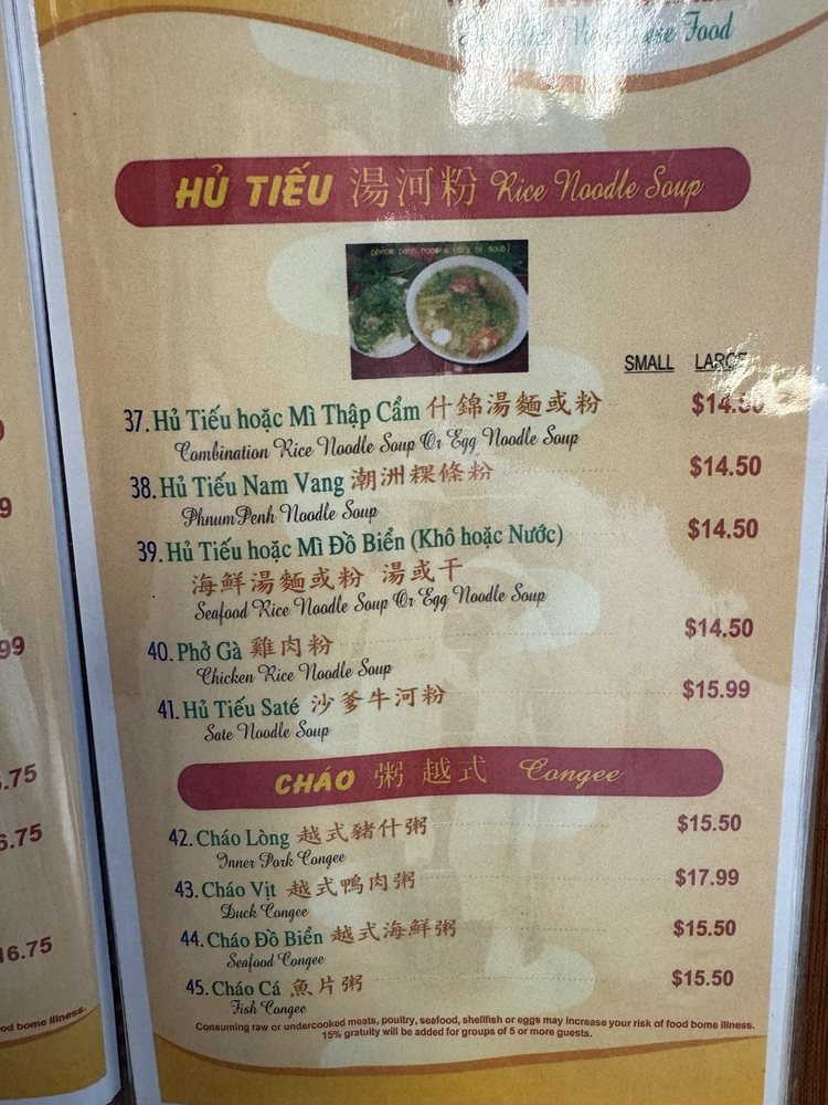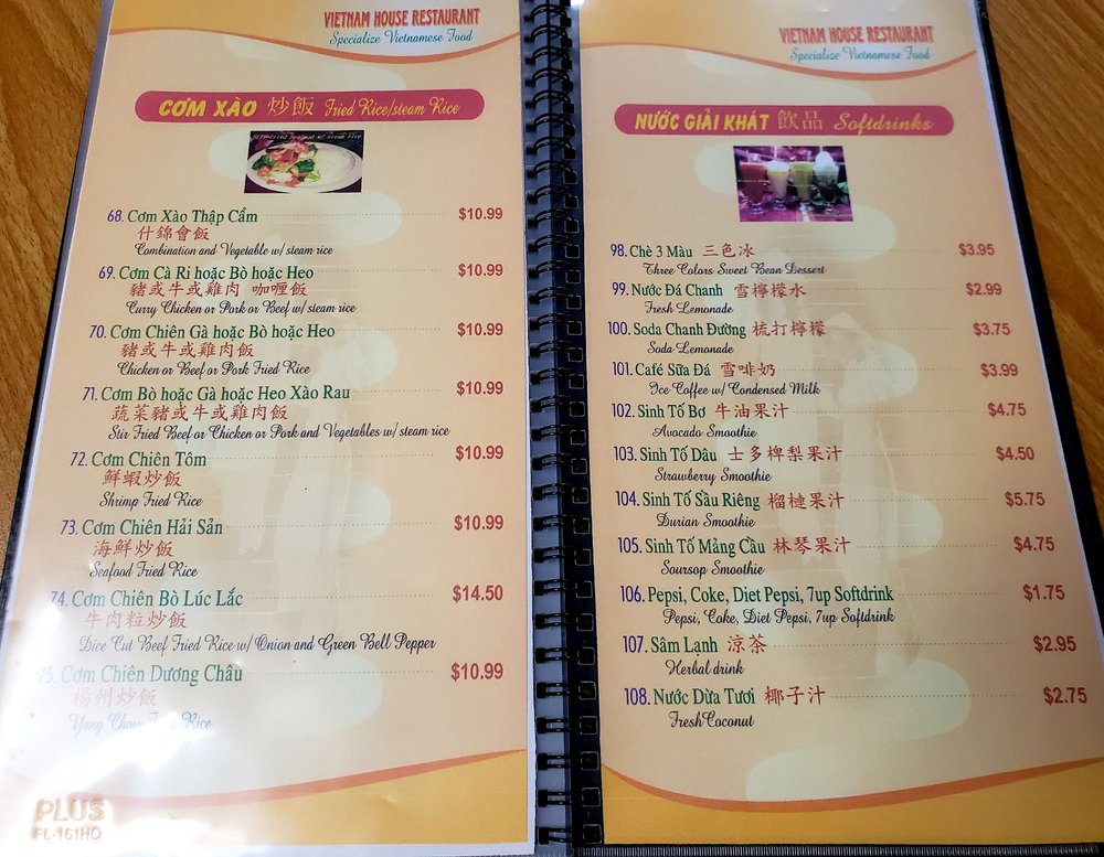Introducing the menu at Vietnam House, located in Seattle's historic Chinatown-International District. Offering a fusion of Chinese and Vietnamese cuisine, the restaurant boasts a plethora of appetizers such as Cha Gio Egg rolls and Dau Hu Ky Deep-fried bean curd shrimp rolls. The Hu Tieu section features delectable noodle soups like Hu Tieu Nam Vang and Pho Ga. Customer reviews rave about the flavorful dishes, including the Bún măng vịt (duck noodle soup) and Com Tam Suon Bi Cha (broken rice with pork chop and pork skin baked egg). The menu is diverse, with options for vegetarians and meat-lovers alike. Vietnam House provides a cozy and authentic dining experience, perfect for groups, families, or a casual lunch or dinner. Delivery and takeout options are available for those looking to enjoy these mouthwatering dishes at home.